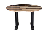 This mixed wood table is a combination of walnut and pecan hickory. It displays a contemporary design with a rustic flair. It is a round table, but can be customized to your desired shape and size. The round shape table top is made from solid walnut, pecan hickory wood and the table legs are