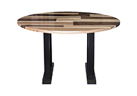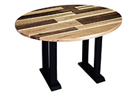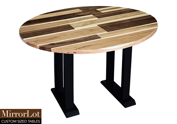 This mixed wood table is a combination of walnut and pecan hickory. It displays a contemporary design with a rustic flair. It is a round table, but can be customized to your desired shape and size. The round shape table top is made from solid walnut, pecan hickory wood and the table legs are