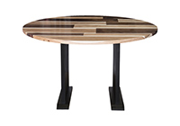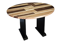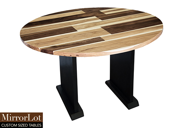 This mixed wood table is a combination of walnut and pecan hickory. It displays a contemporary design with a rustic flair. It is a round table, but can be customized to your desired shape and size. The round shape table top is made from solid walnut, pecan hickory wood and the table legs are