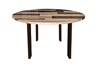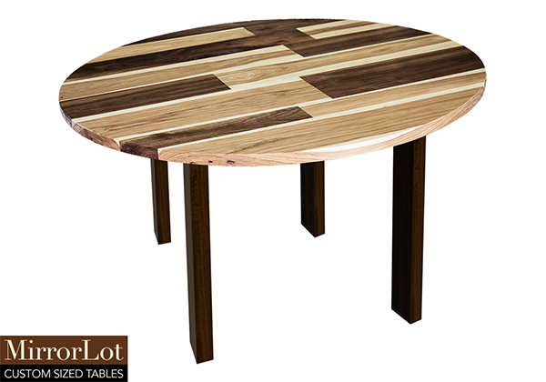 This mixed wood table is a combination of walnut and pecan hickory. It displays a contemporary design with a rustic flair. It is a round table, but can be customized to your desired shape and size. The round shape table top is made from solid walnut, pecan hickory wood and the table legs are