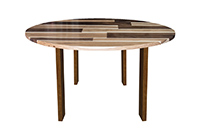 This mixed wood table is a combination of walnut and pecan hickory. It displays a contemporary design with a rustic flair. It is a round table, but can be customized to your desired shape and size. The round shape table top is made from solid walnut, pecan hickory wood and the table legs are