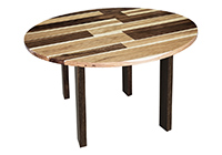 This mixed wood table is a combination of walnut and pecan hickory. It displays a contemporary design with a rustic flair. It is a round table, but can be customized to your desired shape and size. The round shape table top is made from solid walnut, pecan hickory wood and the table legs are