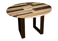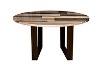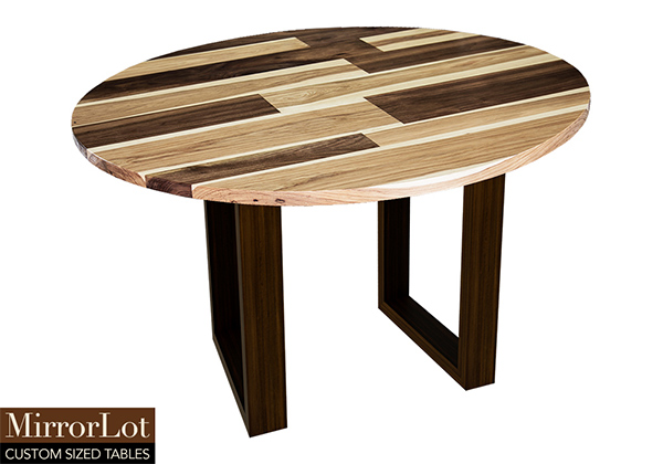 This mixed wood table is a combination of walnut and pecan hickory. It displays a contemporary design with a rustic flair. It is a round table, but can be customized to your desired shape and size. The round shape table top is made from solid walnut, pecan hickory wood and the table legs are