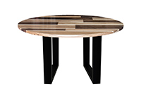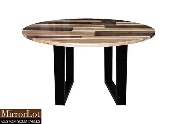 This mixed wood table is a combination of walnut and pecan hickory. It displays a contemporary design with a rustic flair. It is a round table, but can be customized to your desired shape and size. The round shape table top is made from solid walnut, pecan hickory wood and the table legs are