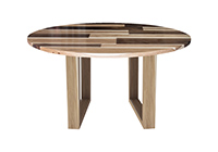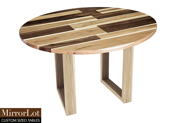 This mixed wood table is a combination of walnut and pecan hickory. It displays a contemporary design with a rustic flair. It is a round table, but can be customized to your desired shape and size. The round shape table top is made from solid walnut, pecan hickory wood and the table legs are