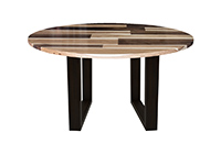 This mixed wood table is a combination of walnut and pecan hickory. It displays a contemporary design with a rustic flair. It is a round table, but can be customized to your desired shape and size. The round shape table top is made from solid walnut, pecan hickory wood and the table legs are