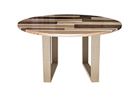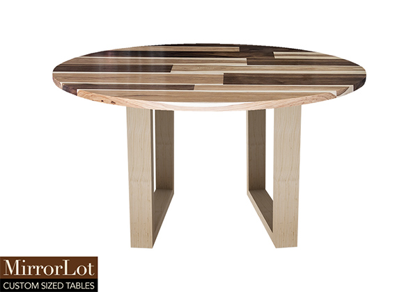 This mixed wood table is a combination of walnut and pecan hickory. It displays a contemporary design with a rustic flair. It is a round table, but can be customized to your desired shape and size. The round shape table top is made from solid walnut, pecan hickory wood and the table legs are