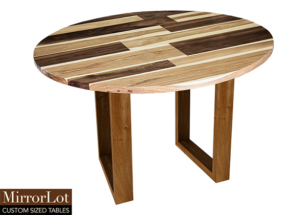 This mixed wood table is a combination of walnut and pecan hickory. It displays a contemporary design with a rustic flair. It is a round table, but can be customized to your desired shape and size. The round shape table top is made from solid walnut, pecan hickory wood and the table legs are