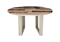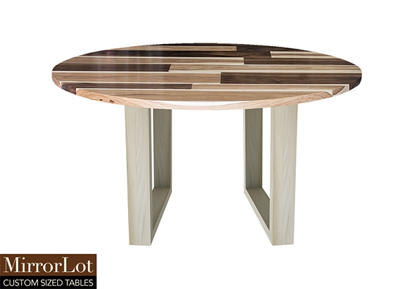 This mixed wood table is a combination of walnut and pecan hickory. It displays a contemporary design with a rustic flair. It is a round table, but can be customized to your desired shape and size. The round shape table top is made from solid walnut, pecan hickory wood and the table legs are