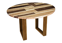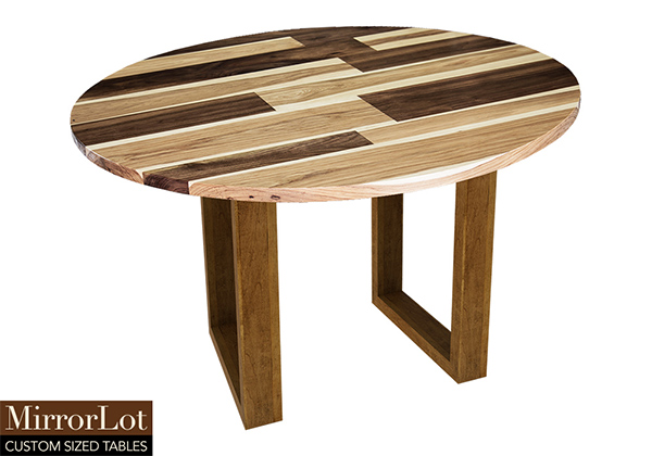 This mixed wood table is a combination of walnut and pecan hickory. It displays a contemporary design with a rustic flair. It is a round table, but can be customized to your desired shape and size. The round shape table top is made from solid walnut, pecan hickory wood and the table legs are