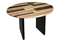 This mixed wood table is a combination of walnut and pecan hickory. It displays a contemporary design with a rustic flair. It is a round table, but can be customized to your desired shape and size. The round shape table top is made from solid walnut, pecan hickory wood and the table legs are