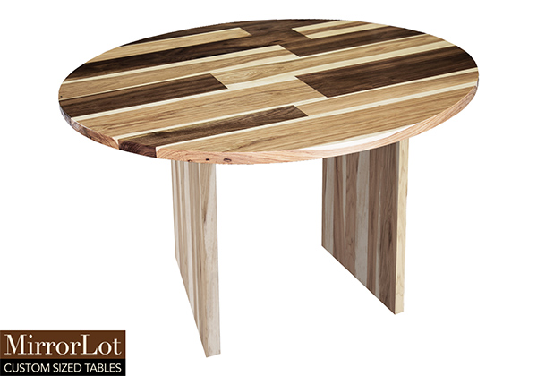 This mixed wood table is a combination of walnut and pecan hickory. It displays a contemporary design with a rustic flair. It is a round table, but can be customized to your desired shape and size. The round shape table top is made from solid walnut, pecan hickory wood and the table legs are