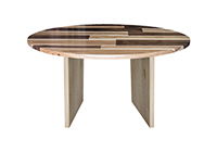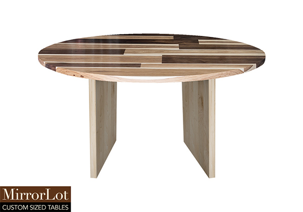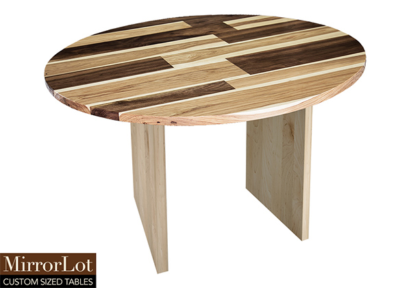 This mixed wood table is a combination of walnut and pecan hickory. It displays a contemporary design with a rustic flair. It is a round table, but can be customized to your desired shape and size. The round shape table top is made from solid walnut, pecan hickory wood and the table legs are