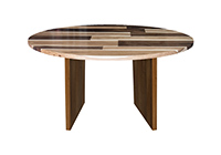 This mixed wood table is a combination of walnut and pecan hickory. It displays a contemporary design with a rustic flair. It is a round table, but can be customized to your desired shape and size. The round shape table top is made from solid walnut, pecan hickory wood and the table legs are
