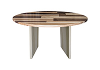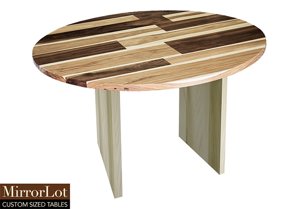 This mixed wood table is a combination of walnut and pecan hickory. It displays a contemporary design with a rustic flair. It is a round table, but can be customized to your desired shape and size. The round shape table top is made from solid walnut, pecan hickory wood and the table legs are
