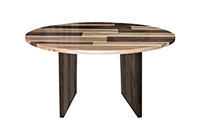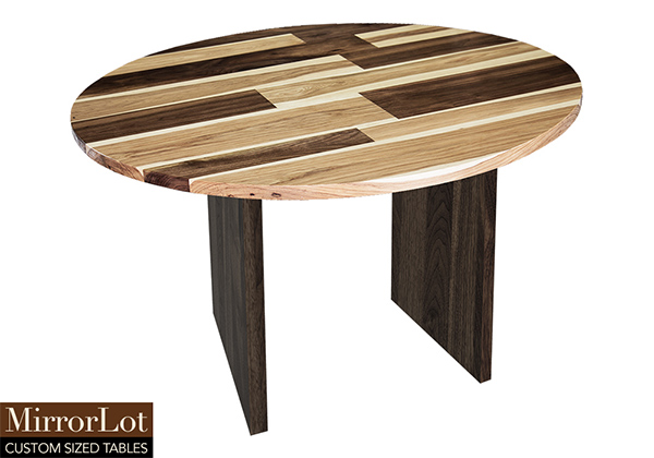 This mixed wood table is a combination of walnut and pecan hickory. It displays a contemporary design with a rustic flair. It is a round table, but can be customized to your desired shape and size. The round shape table top is made from solid walnut, pecan hickory wood and the table legs are