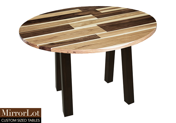 This mixed wood table is a combination of walnut and pecan hickory. It displays a contemporary design with a rustic flair. It is a round table, but can be customized to your desired shape and size. The round shape table top is made from solid walnut, pecan hickory wood and the table legs are