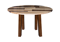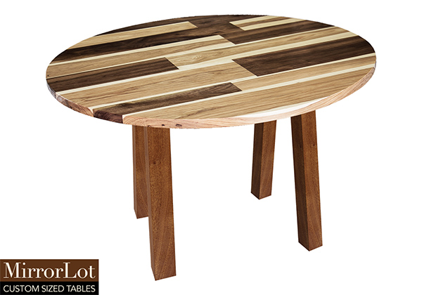This mixed wood table is a combination of walnut and pecan hickory. It displays a contemporary design with a rustic flair. It is a round table, but can be customized to your desired shape and size. The round shape table top is made from solid walnut, pecan hickory wood and the table legs are