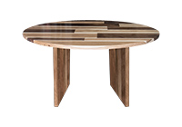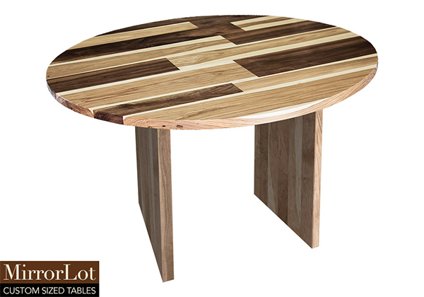 This mixed wood table is a combination of walnut and pecan hickory. It displays a contemporary design with a rustic flair. It is a round table, but can be customized to your desired shape and size. The round shape table top is made from solid walnut, pecan hickory wood and the table legs are