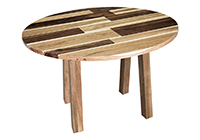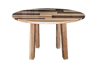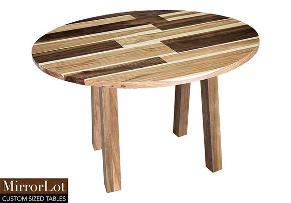 This mixed wood table is a combination of walnut and pecan hickory. It displays a contemporary design with a rustic flair. It is a round table, but can be customized to your desired shape and size. The round shape table top is made from solid walnut, pecan hickory wood and the table legs are