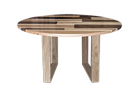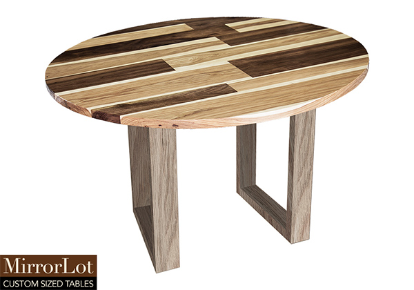 This mixed wood table is a combination of walnut and pecan hickory. It displays a contemporary design with a rustic flair. It is a round table, but can be customized to your desired shape and size. The round shape table top is made from solid walnut, pecan hickory wood and the table legs are