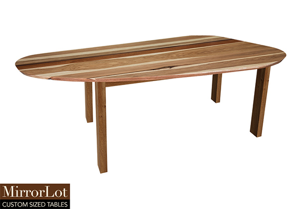 This mixed wood table is a combination natural mahogany, walnut, and pecan hickory. It displays a contemporary design with a rustic flair. It has a unique shape with a beveled edge, but can be customized to your desired shape and size. The beveled knife edge unique round shape table top is made from solid walnut, mahogany, pecan hickory wood and the table legs are