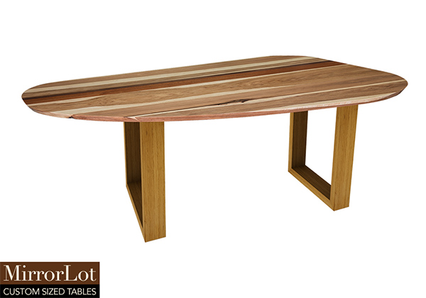 This mixed wood table is a combination natural mahogany, walnut, and pecan hickory. It displays a contemporary design with a rustic flair. It has a unique shape with a beveled edge, but can be customized to your desired shape and size. The beveled knife edge unique round shape table top is made from solid walnut, mahogany, pecan hickory wood and the table legs are
