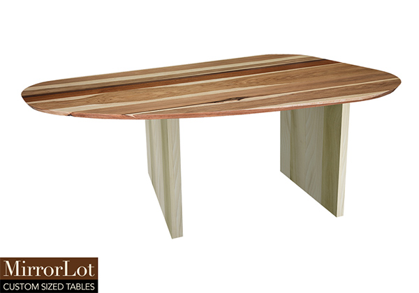 This mixed wood table is a combination natural mahogany, walnut, and pecan hickory. It displays a contemporary design with a rustic flair. It has a unique shape with a beveled edge, but can be customized to your desired shape and size. The beveled knife edge unique round shape table top is made from solid walnut, mahogany, pecan hickory wood and the table legs are