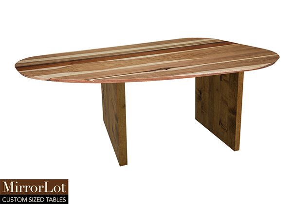 This mixed wood table is a combination natural mahogany, walnut, and pecan hickory. It displays a contemporary design with a rustic flair. It has a unique shape with a beveled edge, but can be customized to your desired shape and size. The beveled knife edge unique round shape table top is made from solid walnut, mahogany, pecan hickory wood and the table legs are