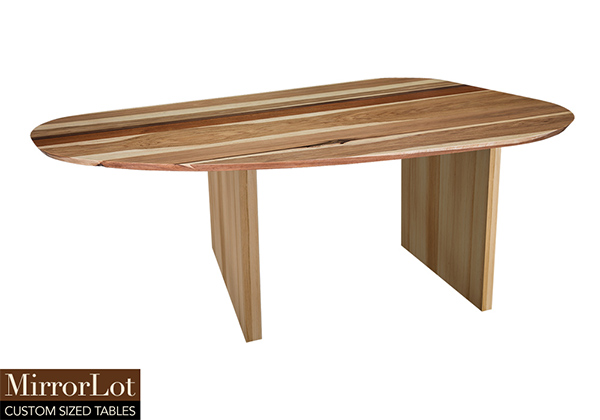 This mixed wood table is a combination natural mahogany, walnut, and pecan hickory. It displays a contemporary design with a rustic flair. It has a unique shape with a beveled edge, but can be customized to your desired shape and size. The beveled knife edge unique round shape table top is made from solid walnut, mahogany, pecan hickory wood and the table legs are