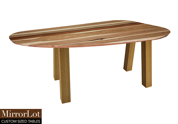 This mixed wood table is a combination natural mahogany, walnut, and pecan hickory. It displays a contemporary design with a rustic flair. It has a unique shape with a beveled edge, but can be customized to your desired shape and size. The beveled knife edge unique round shape table top is made from solid walnut, mahogany, pecan hickory wood and the table legs are