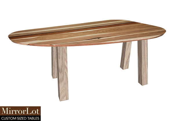 This mixed wood table is a combination natural mahogany, walnut, and pecan hickory. It displays a contemporary design with a rustic flair. It has a unique shape with a beveled edge, but can be customized to your desired shape and size. The beveled knife edge unique round shape table top is made from solid walnut, mahogany, pecan hickory wood and the table legs are