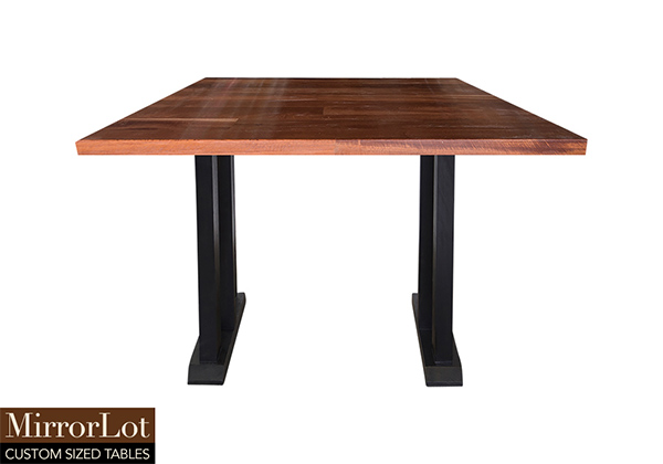 This natural mahogany table brings rustic charm to any room in your house. It is square, but can be customized to your desired shape and size. The square shape table top is made from solid mahogany wood and the table legs are