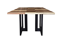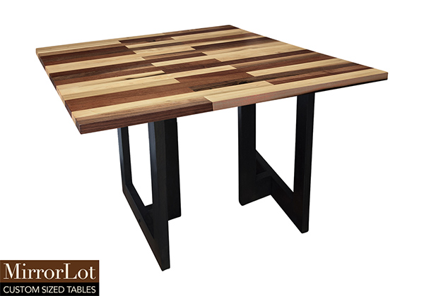 This mixed wood table is a combination natural mahogany, walnut, and poplar. It displays a contemporary design with a rustic flair. It is square, but can be customized to your desired shape and size. The square shape table top is made from solid walnut, mahogany, poplar wood and the table legs are