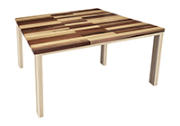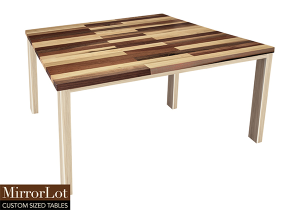 This mixed wood table is a combination natural mahogany, walnut, and poplar. It displays a contemporary design with a rustic flair. It is square, but can be customized to your desired shape and size. The square shape table top is made from solid walnut, mahogany, poplar wood and the table legs are