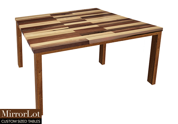 This mixed wood table is a combination natural mahogany, walnut, and poplar. It displays a contemporary design with a rustic flair. It is square, but can be customized to your desired shape and size. The square shape table top is made from solid walnut, mahogany, poplar wood and the table legs are