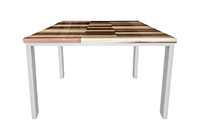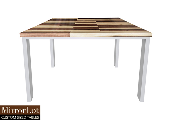 This mixed wood table is a combination natural mahogany, walnut, and poplar. It displays a contemporary design with a rustic flair. It is square, but can be customized to your desired shape and size. The square shape table top is made from solid walnut, mahogany, poplar wood and the table legs are