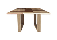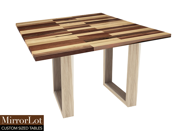 This mixed wood table is a combination natural mahogany, walnut, and poplar. It displays a contemporary design with a rustic flair. It is square, but can be customized to your desired shape and size. The square shape table top is made from solid walnut, mahogany, poplar wood and the table legs are