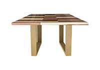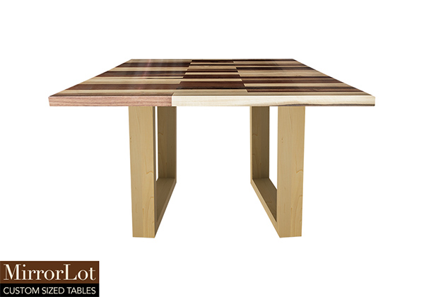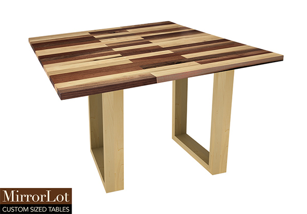 This mixed wood table is a combination natural mahogany, walnut, and poplar. It displays a contemporary design with a rustic flair. It is square, but can be customized to your desired shape and size. The square shape table top is made from solid walnut, mahogany, poplar wood and the table legs are