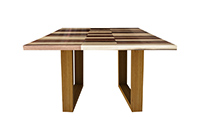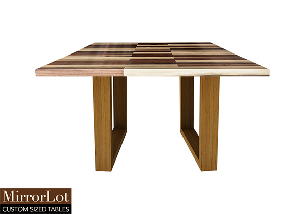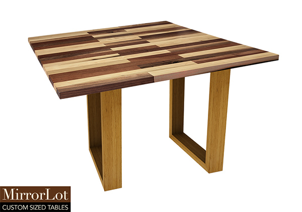 This mixed wood table is a combination natural mahogany, walnut, and poplar. It displays a contemporary design with a rustic flair. It is square, but can be customized to your desired shape and size. The square shape table top is made from solid walnut, mahogany, poplar wood and the table legs are