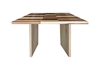 This mixed wood table is a combination natural mahogany, walnut, and poplar. It displays a contemporary design with a rustic flair. It is square, but can be customized to your desired shape and size. The square shape table top is made from solid walnut, mahogany, poplar wood and the table legs are