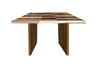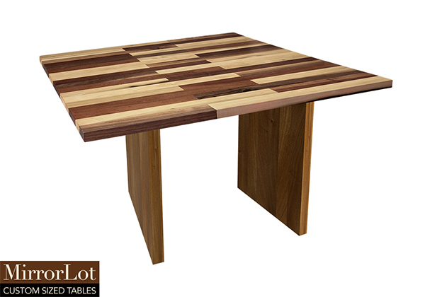 This mixed wood table is a combination natural mahogany, walnut, and poplar. It displays a contemporary design with a rustic flair. It is square, but can be customized to your desired shape and size. The square shape table top is made from solid walnut, mahogany, poplar wood and the table legs are
