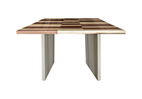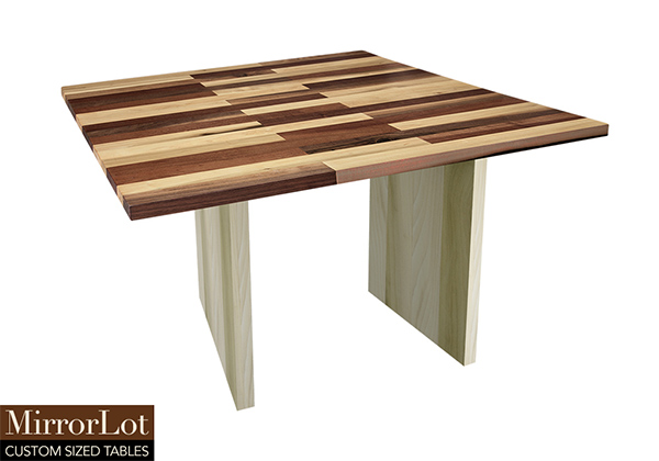 This mixed wood table is a combination natural mahogany, walnut, and poplar. It displays a contemporary design with a rustic flair. It is square, but can be customized to your desired shape and size. The square shape table top is made from solid walnut, mahogany, poplar wood and the table legs are