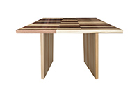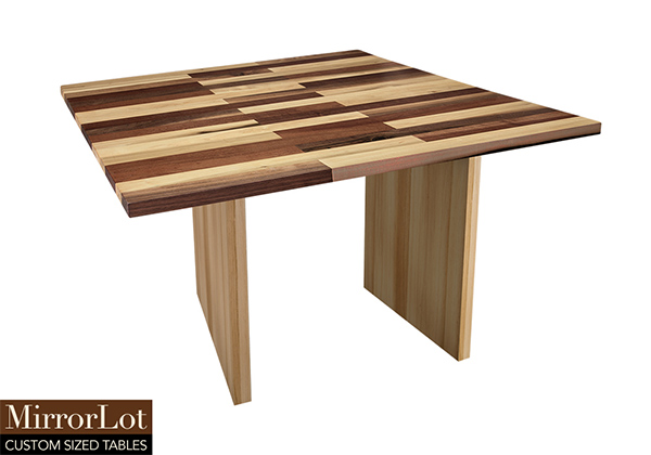 This mixed wood table is a combination natural mahogany, walnut, and poplar. It displays a contemporary design with a rustic flair. It is square, but can be customized to your desired shape and size. The square shape table top is made from solid walnut, mahogany, poplar wood and the table legs are