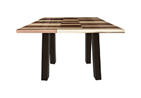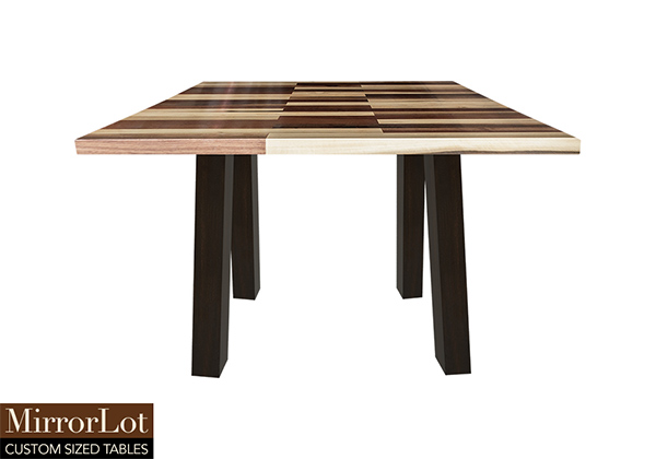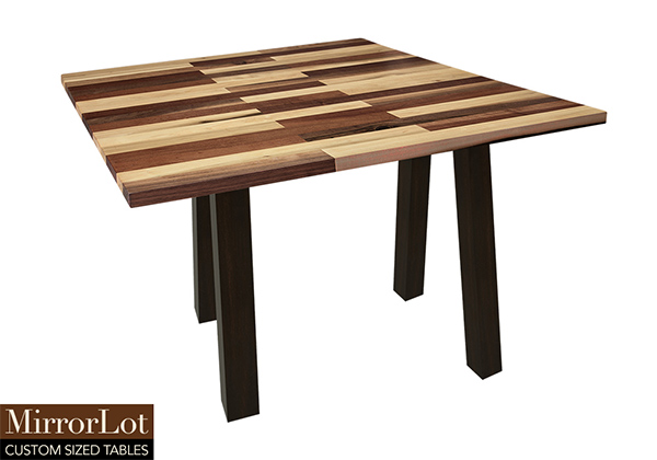 This mixed wood table is a combination natural mahogany, walnut, and poplar. It displays a contemporary design with a rustic flair. It is square, but can be customized to your desired shape and size. The square shape table top is made from solid walnut, mahogany, poplar wood and the table legs are