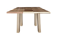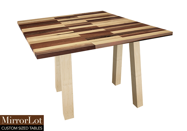 This mixed wood table is a combination natural mahogany, walnut, and poplar. It displays a contemporary design with a rustic flair. It is square, but can be customized to your desired shape and size. The square shape table top is made from solid walnut, mahogany, poplar wood and the table legs are