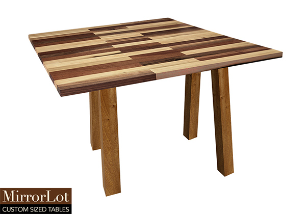 This mixed wood table is a combination natural mahogany, walnut, and poplar. It displays a contemporary design with a rustic flair. It is square, but can be customized to your desired shape and size. The square shape table top is made from solid walnut, mahogany, poplar wood and the table legs are