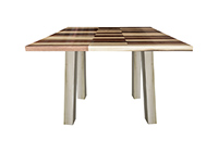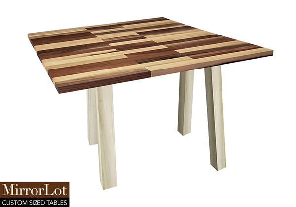 This mixed wood table is a combination natural mahogany, walnut, and poplar. It displays a contemporary design with a rustic flair. It is square, but can be customized to your desired shape and size. The square shape table top is made from solid walnut, mahogany, poplar wood and the table legs are