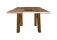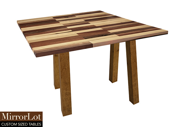 This mixed wood table is a combination natural mahogany, walnut, and poplar. It displays a contemporary design with a rustic flair. It is square, but can be customized to your desired shape and size. The square shape table top is made from solid walnut, mahogany, poplar wood and the table legs are