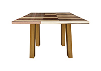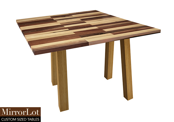 This mixed wood table is a combination natural mahogany, walnut, and poplar. It displays a contemporary design with a rustic flair. It is square, but can be customized to your desired shape and size. The square shape table top is made from solid walnut, mahogany, poplar wood and the table legs are